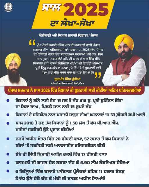 ਪੰਜਾਬ ਦੇ ਖੇਤੀਬਾੜੀ ਅਤੇ ਕਿਸਾਨ ਭਲਾਈ ਮੰਤਰੀ ਸ. ਗੁਰਮੀਤ ਸਿੰਘ ਖੁੱਡੀਆਂ ਨੇ ਇਸ ਸਾਲ ਦੀਆਂ ਅਹਿਮ ਪ੍ਰਾਪਤੀਆਂ ਦਾ ਜ਼ਿਕਰ ਕਰਦਿਆਂ ਦੱਸਿਆ ਕਿ ਸੂਬਾ ਸਰਕਾਰ ਦਾ ਉਦੇਸ਼ ਕਿਸਾਨਾਂ ਨੂੰ ਸਸ਼ਕਤ ਬਣਾਉਣ ਦੇ ਨਾਲ ਨਾਲ ਵਾਤਾਵਰਣਕ ਸਥਿਰਤਾ ਨੂੰ ਯਕੀਨੀ ਬਣਾਉਣਾ ਹੈ। ਉਨ੍ਹਾਂ ਕਿਹਾ ਕਿ ਸਾਡੀਆਂ ਯੋਜਨਾਵਾਂ ਨੇ ਮਿਸਾਲੀ ਤਬਦੀਲੀ ਲਿਆਂਦੀ ਹੈ ਅਤੇ ਗੰਨੇ ਦੀ ਕੀਮਤ ਵਿੱਚ ਕੀਤਾ ਰਿਕਾਰਡ ਵਾਧਾ ਕਿਸਾਨਾਂ ਦੀ ਸਖ਼ਤ ਮਿਹਨਤ ਦੇ ਸਨਮਾਨ ਪ੍ਰਤੀ ਸਾਡੀ ਵਚਨਬੱਧਤਾ ਨੂੰ ਦਰਸਾਉਂਦਾ ਹੈ।